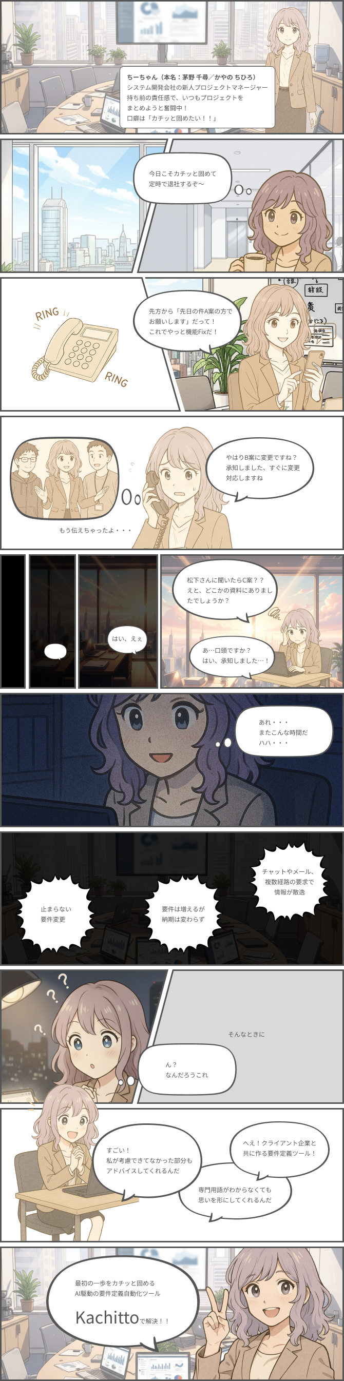 ちーちゃんが「なんだろうこれ」と興味を持ったように、この「情報散逸」の問題を根本から解決するのが、AI駆動型要件定義自動化ツール「Kachitto」です。