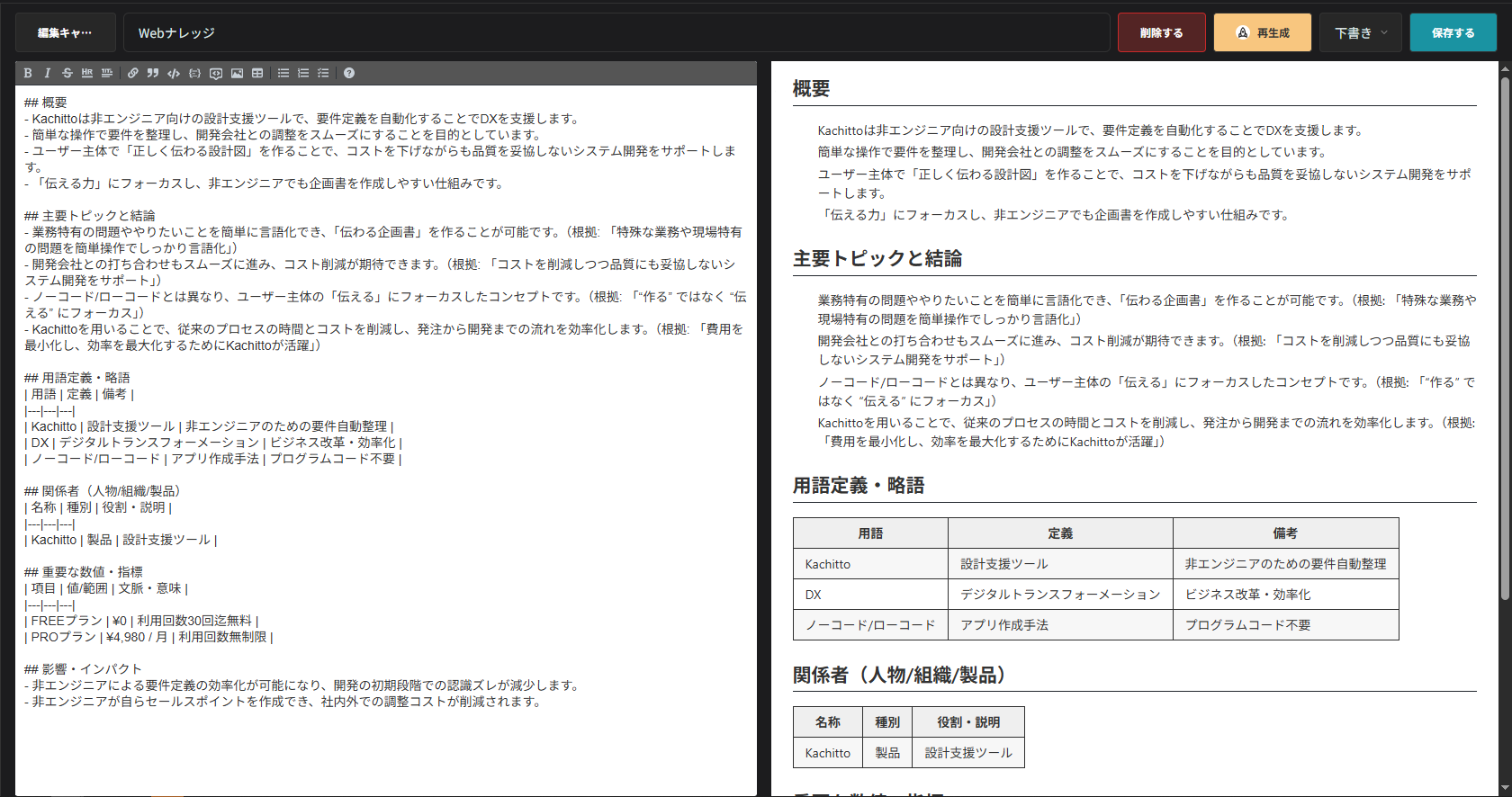 この「リサーチの質と効率」の壁を、Kachittoの「Webナレッジ生成機能」が解決します。