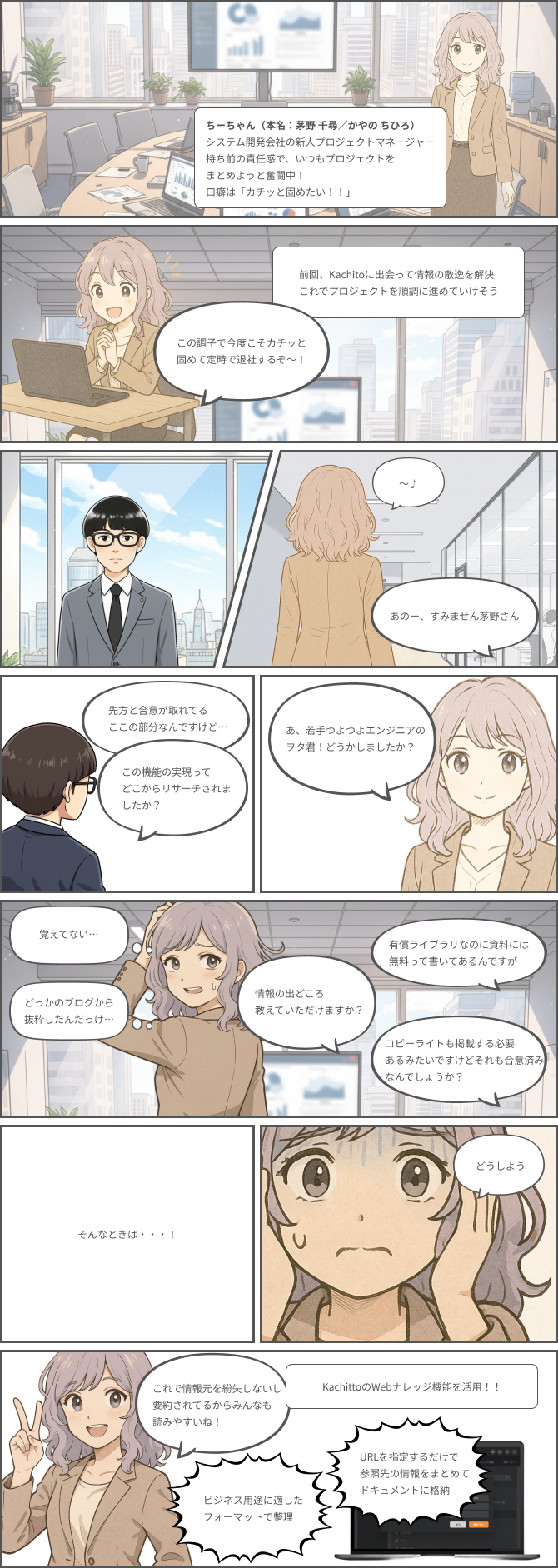 ちーちゃんが焦って「どうしよう…」と頭を抱えたように、膨大なWeb情報の中から信頼できる情報を抽出し、ビジネス文書のフォーマットに整える作業は、非常に時間がかかり、企画の遅延を招く大きな原因となります。